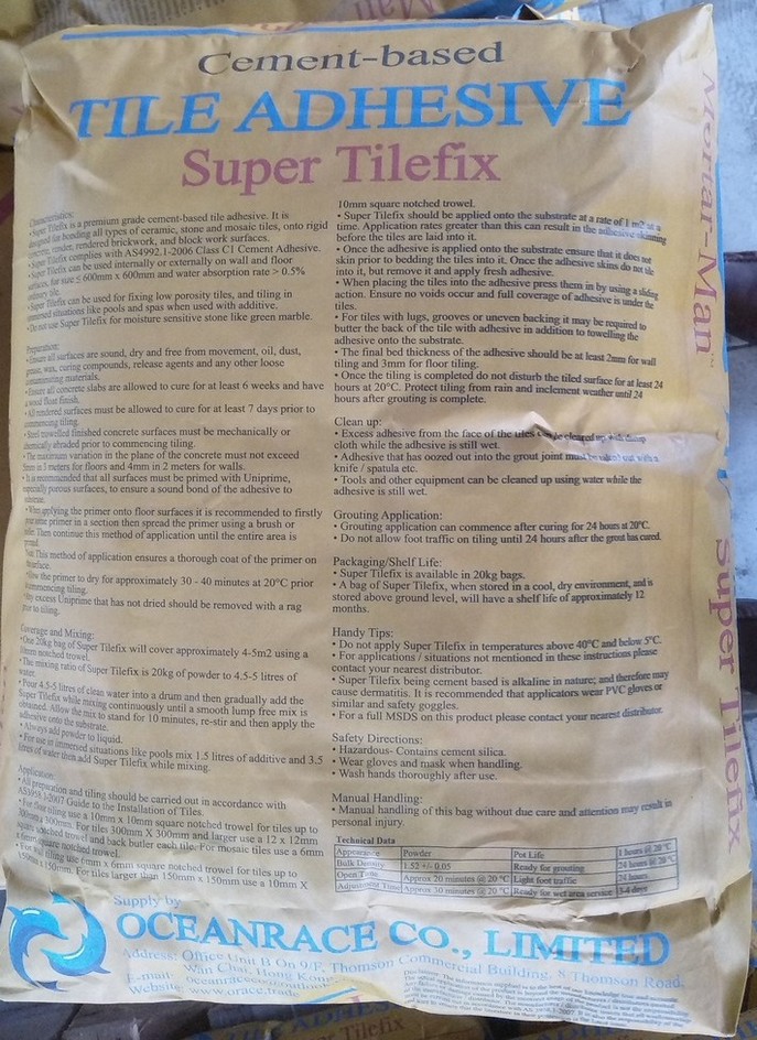Complies with AS 4992 Ceramic tiles – Grouts and adhesives, selling in Papua New Guinea since 2017, local workers have reported good quality and sales.